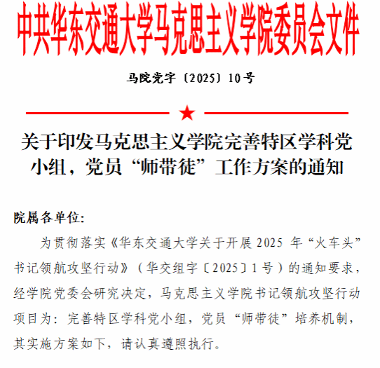 为贯彻落实《华东交通大学关于开展2025 年“火车头”书记领航攻坚行动》(华交组字〔2025〕1号)文件精神,学院党委高度重视“火车头”书记领航攻坚项目,制定《马克思主义学院完善特区学科党小组,党员“师带徒”工作方案》,以“红马达”党建品牌为旗帜,深度推进党建工作与教学、科研业务的有机融合。强化党组织在学科建设中的引领作用,通过“师带徒”机制,让党建工作贯穿于教学科研的各个环节,加快青年人才成长,使党建与业务从“相加”迈向“相融”,形成“红马达”品牌驱动的发展合力。